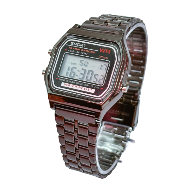 O Kit Retrô acompanha 10 relógios digitais, todos com pulseira metálica e modelos super vendáveis.